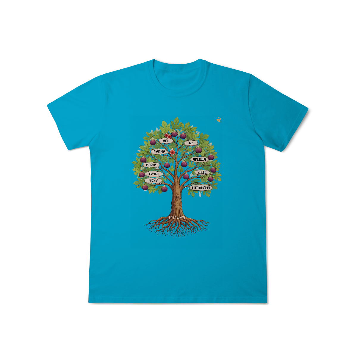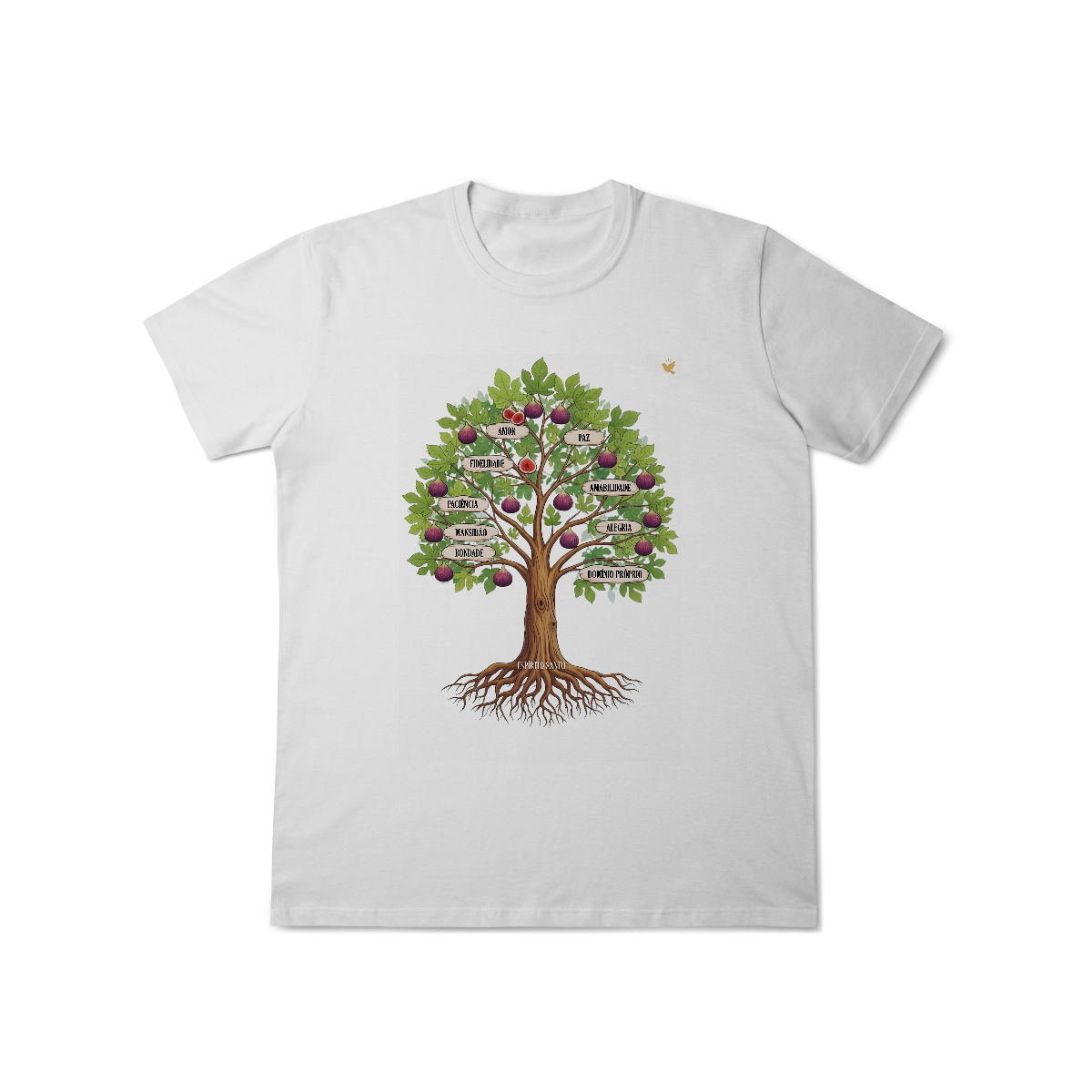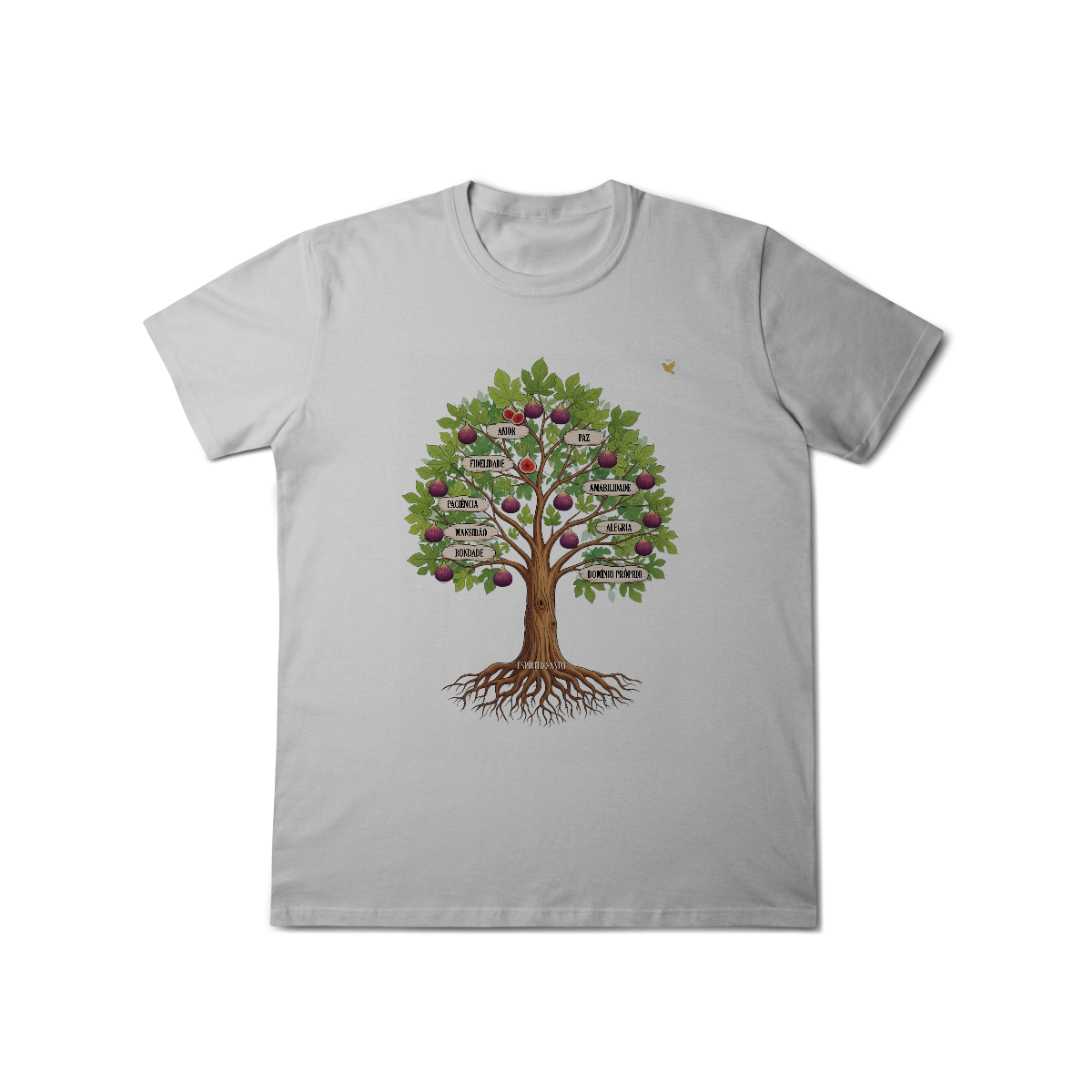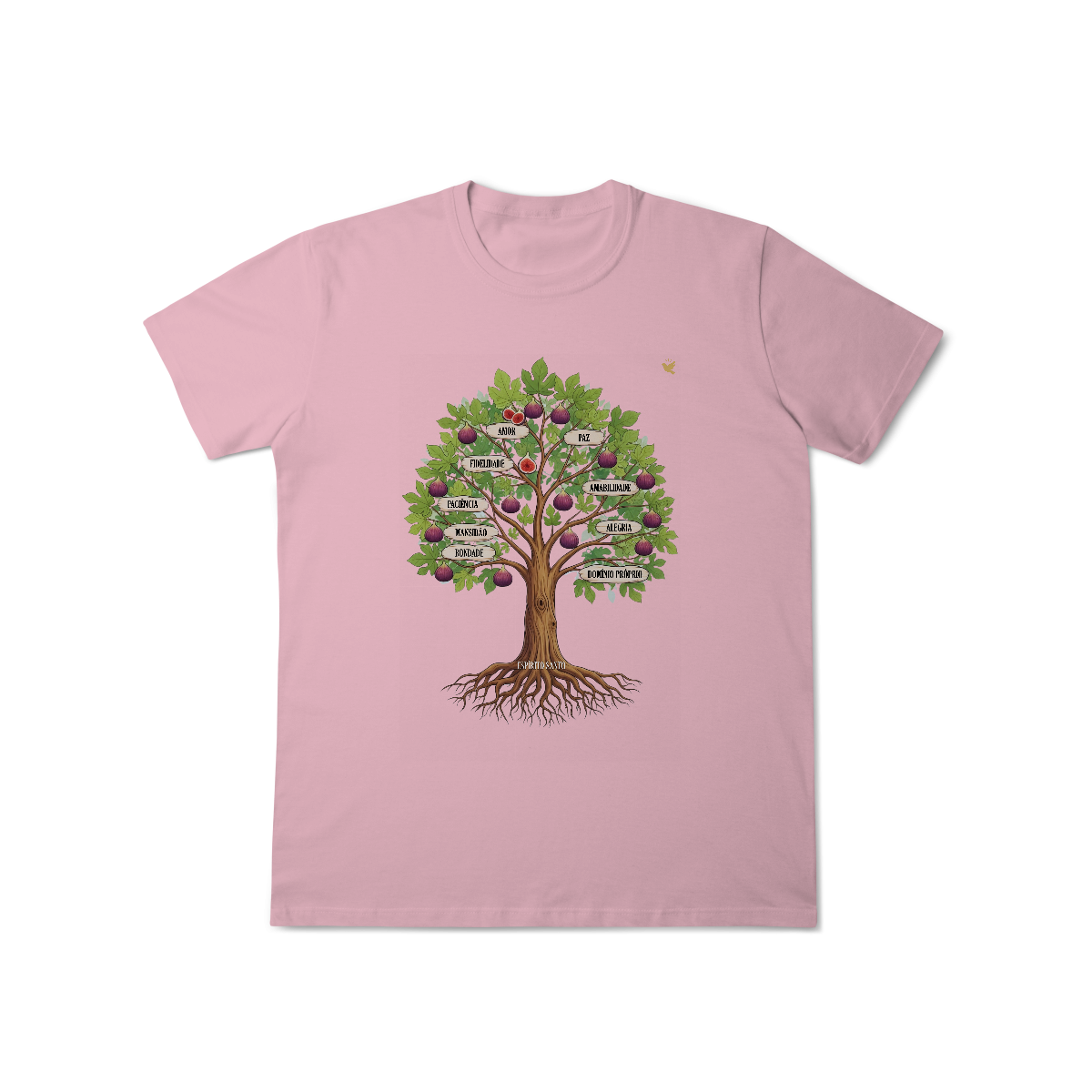Uma estampa devocional inspirada em Gálatas 5:22-23. Os Frutos Espírito: Amor, Alegria, Paz, Paciência, Bondade, Fidelidade, Mansidão, Amabilidade e Domínio Próprio.