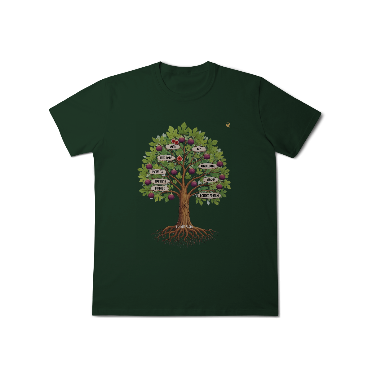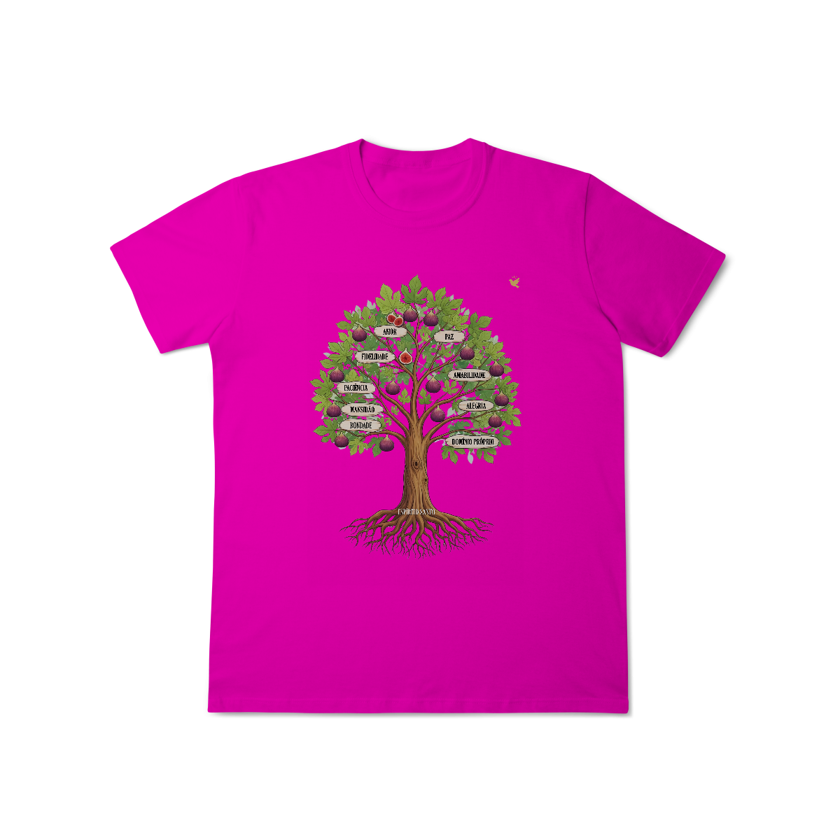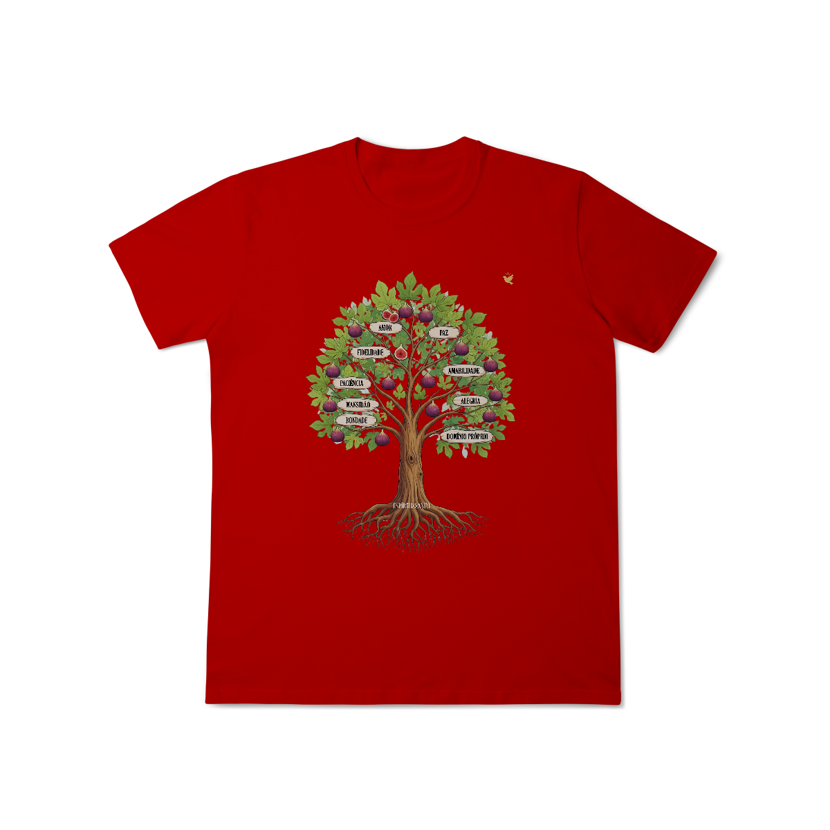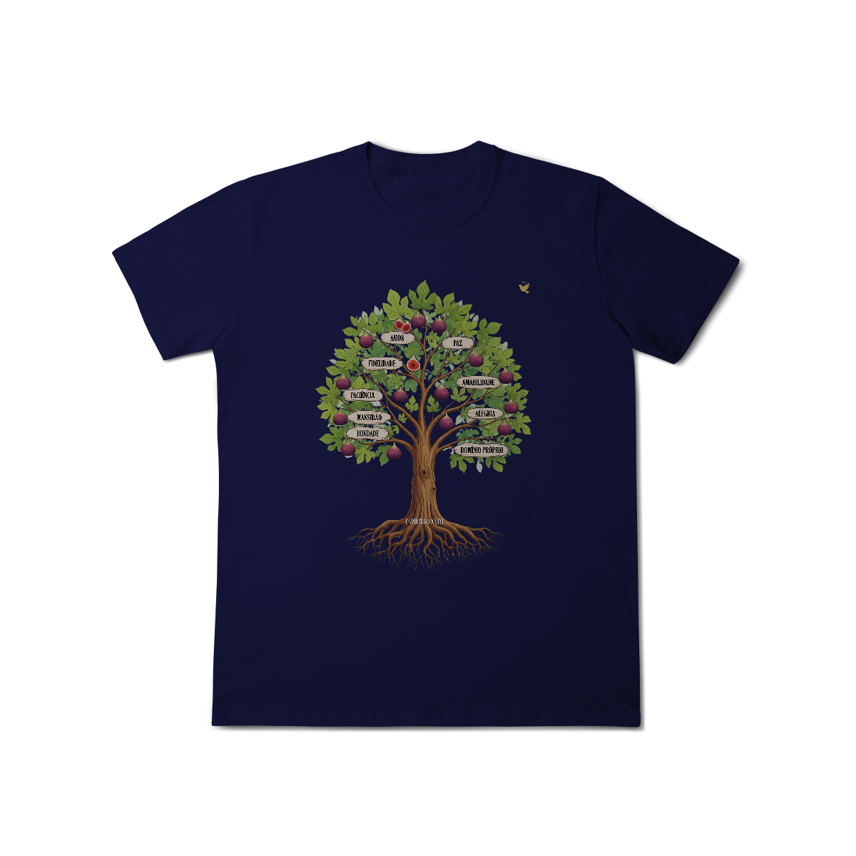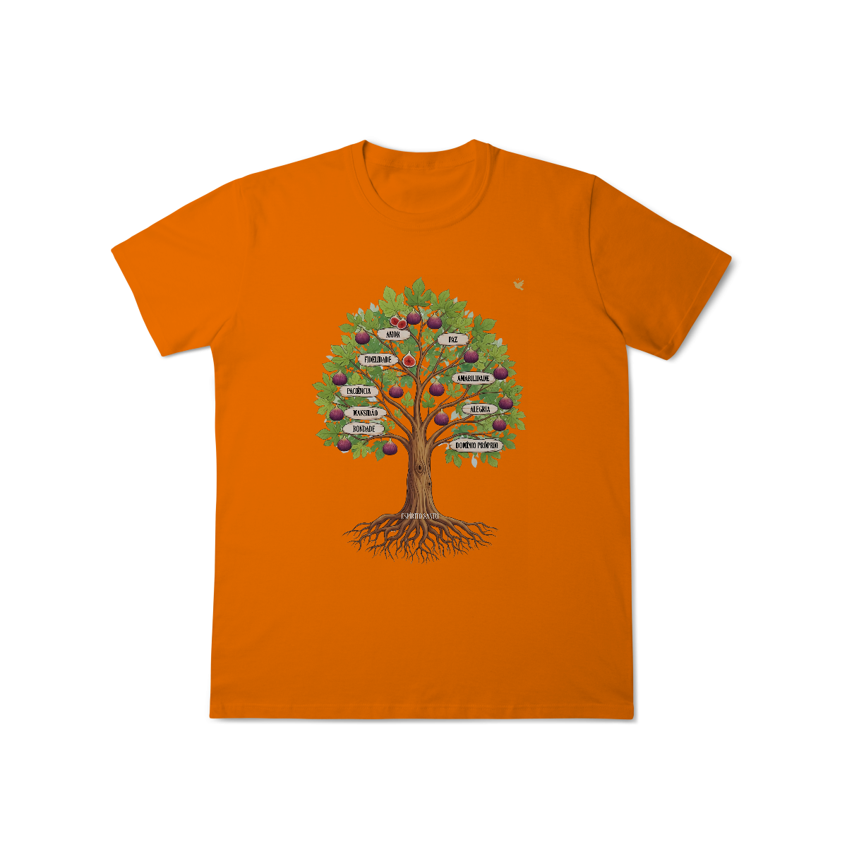 Uma estampa devocional inspirada em Gálatas 5:22-23. Os Frutos Espírito: Amor, Alegria, Paz, Paciência, Bondade, Fidelidade, Mansidão, Amabilidade e Domínio Próprio.