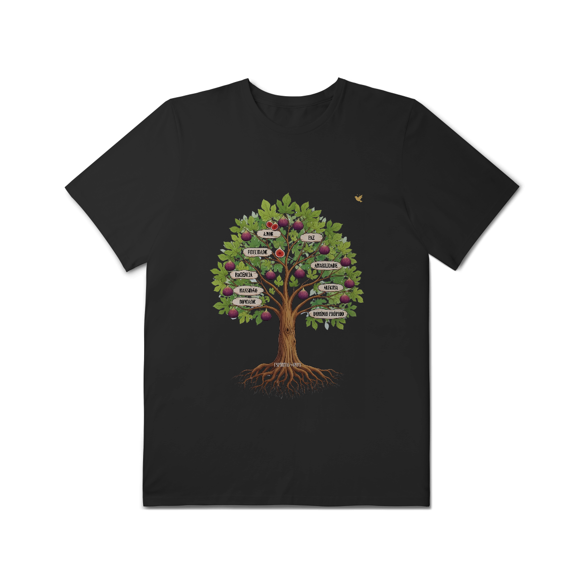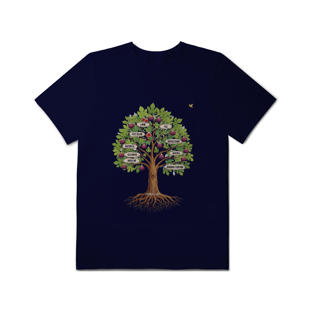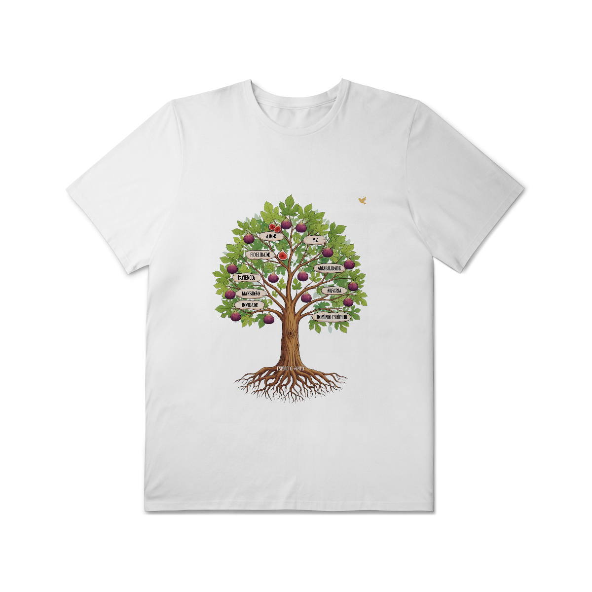 Uma estampa devocional inspirada em Gálatas 5:22-23. Os Frutos Espírito: Amor, Alegria, Paz, Paciência, Bondade, Fidelidade, Mansidão, Amabilidade e Domínio Próprio.