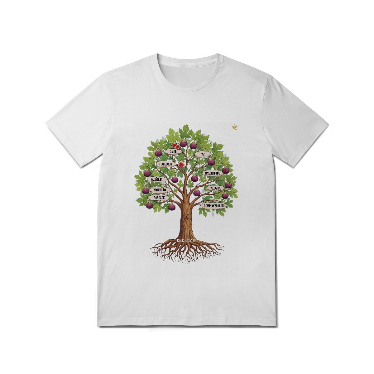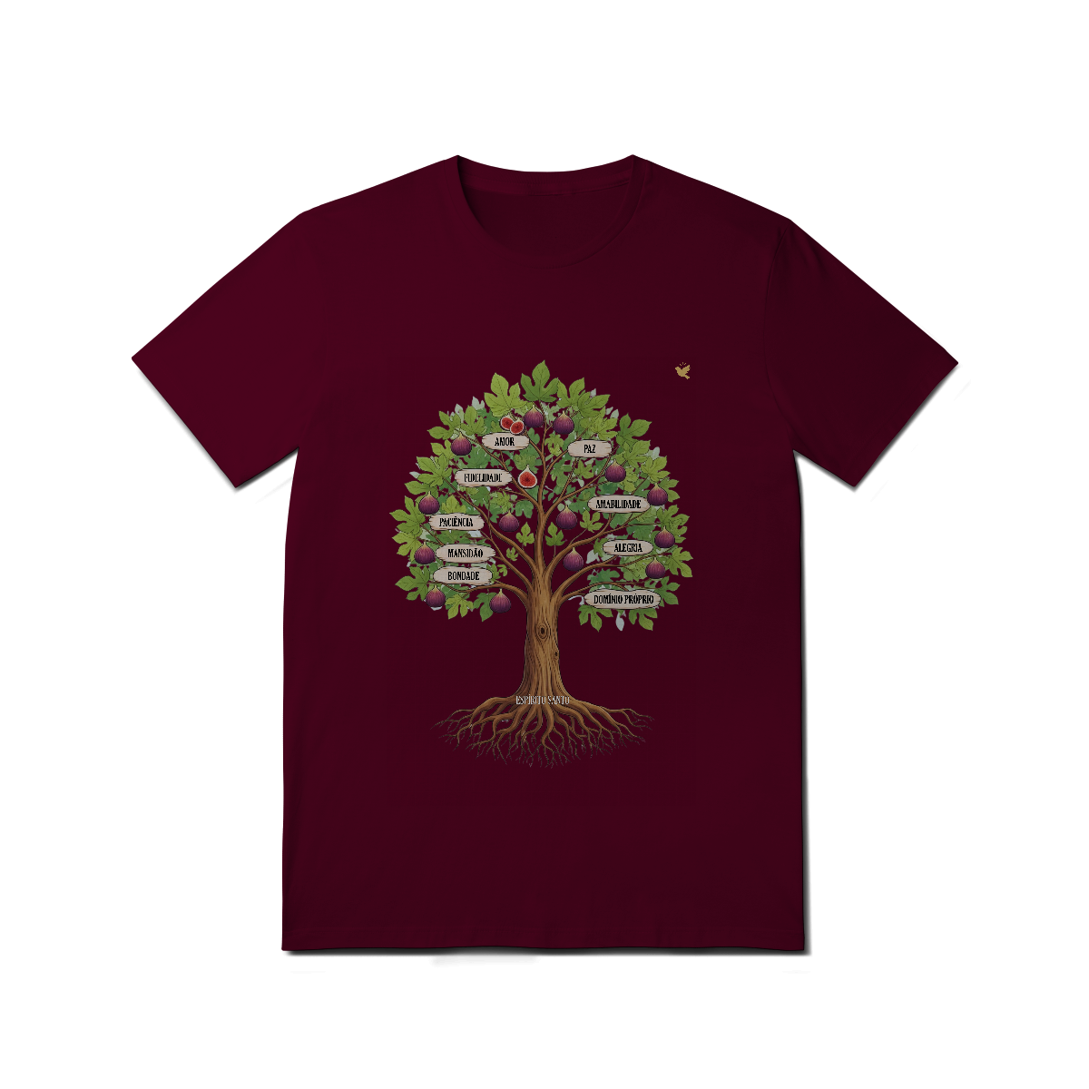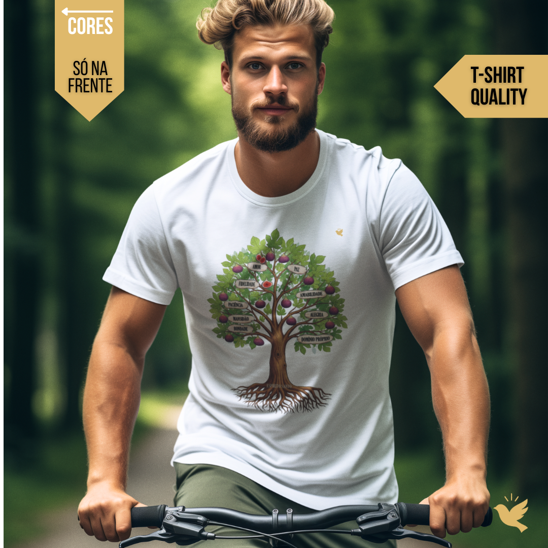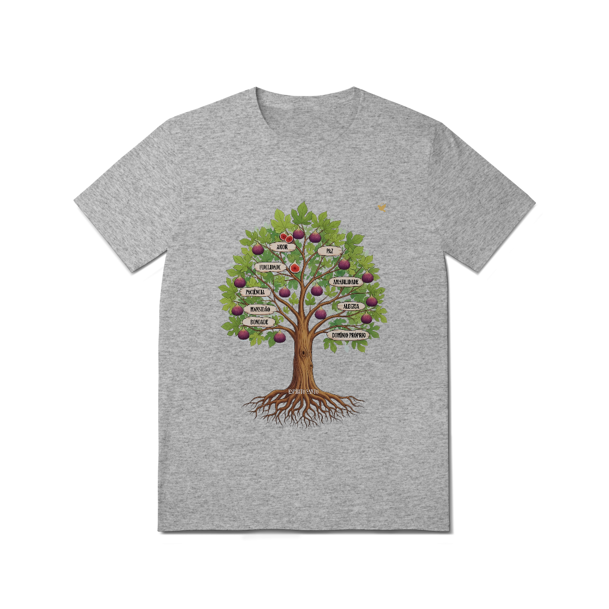 Uma estampa devocional inspirada em Gálatas 5:22-23. Os Frutos Espírito: Amor, Alegria, Paz, Paciência, Bondade, Fidelidade, Mansidão, Amabilidade e Domínio Próprio.