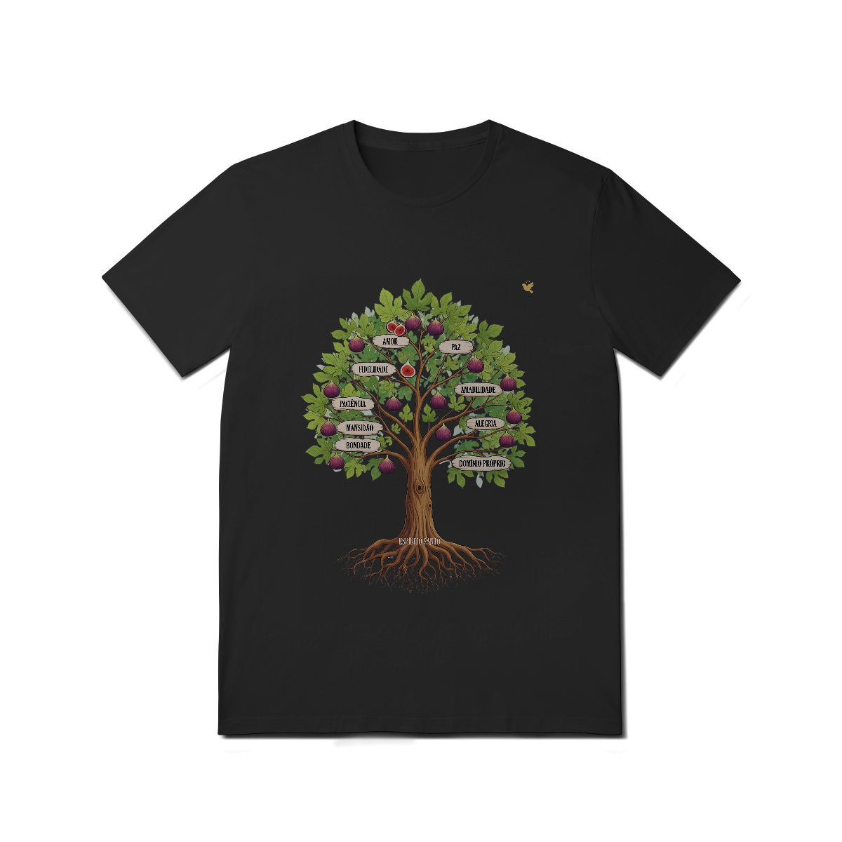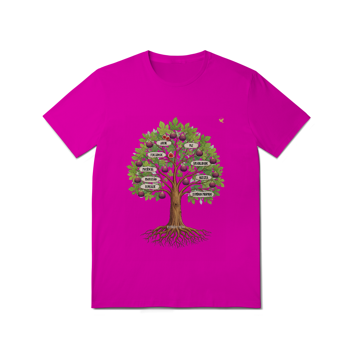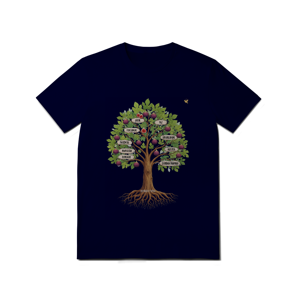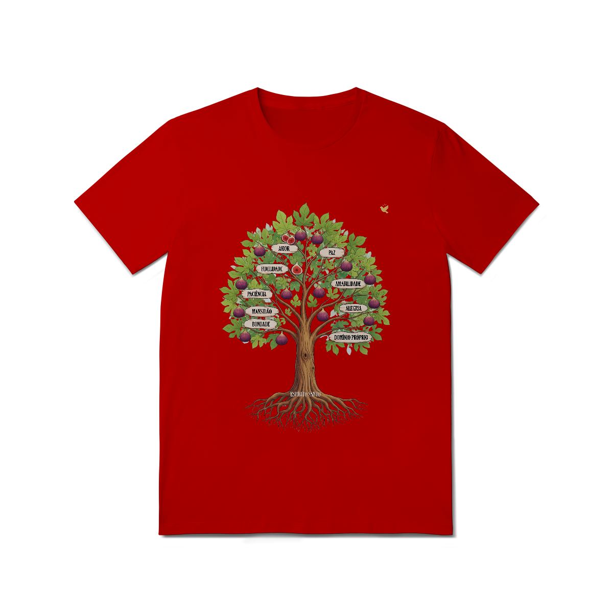 Uma estampa devocional inspirada em Gálatas 5:22-23. Os Frutos Espírito: Amor, Alegria, Paz, Paciência, Bondade, Fidelidade, Mansidão, Amabilidade e Domínio Próprio.